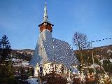 | Detalii: | Construită în jur de 1791. După 1863, din dorința înnoirilor, bârnele lăcașului au fost tencuite, răpindu-i-se astfel înfățișarea originară. Se poate remarca însă aici singurul exemplu de decor țărănesc realizat în tencuială. Rozete și flori, soare cu chip omenesc, cruci, reprezentări datate: 1873, 1871, 1878, sunt închipuite în stuc pe fațadele edificiului. Uși și ferestre, perete despărțitor, au fost suprimate prin lucrările de renovare. Tencuită și învelită cu tablă, construcția permite însă aprecierea înfățișării anterioare. O siluetă zveltă, la care concură acoperișul cu pante abrupte, mai coborât la absidă și din care răzbate, pe vest, clopotnița cu foișor și coif frînt. Perechile de console, spre o ușoară atingere, sugerează aripile vulturului. | |||||||