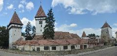 | Alte informații: | În sectorul sudic, între turnul cizmarilor și turnul croitorilor, mai dăinuie vechile șoproane de lemn, acoperișul lor oblic coborând de pe coroana zidului spre curte, de care înainte vreme nu erau despărțite de peretele actual. În interiorul turnurilor se recunoaște construcția din piatră brută, exteriorul lor fiind tencuit. Turnurile cu câte cinci caturi sunt toate prevăzute cu metereze mici, practicabile exclusiv pentru arme de foc, nișele fiind boltite prin arcade de piatră așezate vertical sau acoperite de lespezi suprapuse marginal. Cu excepția turnului croitorilor, caturile inferioare ale turnurilor sunt boltite semicilindric, intrarea spre caturile superioare făcându-se la înălțimea catului al doilea printr-o scară mobilă, azi pe înguste scări de lemn acoperite. Turnurile își datorează denumirile faptului că îngrijirea și apărarea lor erau datoria diferitelor bresle care își păstrau în turnul lor și slănina. Sarea folosită din abundență pentru conservarea slăninii a atacat, până la urmă, lemnăria platformelor din lemn ce separau caturile, unele bârne fiind azi complet putrede. Curtina interioară cuprindea o curte de formă ovală având un diametru de 55-65 m - dacă luăm colțurile interioare ale turnurilor drept puncte de reper - curtina a doua legând colțurile exterioare ale turnurilor. Între aceste două curtine se afla "Zwinger-ul", curtea animalelor, adăpostite acolo în caz de pericol, iar a treia curtină, de formă poligonală neregulată, includea un șanț cu apă, în exterior curtina fiind protejată de pârâul apropiat și de terenul mlăștinos. În 1845 a fost demolată a treia curtină, în 1867 au fost demolate cămările de provizii ce înconjurau incinta interioară, pentru ca în 1870 să cadă și ultimele vestigii ale triplului cordon de curtine, lăsând turnurile complet izolate, din materialul obținut prin demolare construindu-se noua școală. Nucleul cetății în constituia biserica-hală în stil gotic. Corul ei alungit, închis spre est pe trei laturi, precum și nava centrală poartă bolți semicilindrice cu penetrații, ornamentate odinioară cu nervuri de teracotă dispuse în formă stelată, vopsite în roșu, după cum o dovedesc urmele din colțul sud-vestic. Deasupra micilor bolți în cruce ale colateralei nordice s-a ridicat o tribună, pe când colaterala sudică atinge înălțimea navei centrale, acoperită cu bolți în cruce, separate de arcuri dublou în arc frânt. Pe latura de nord s-au conservat stâlpii originari de secțiune pătrată, adosându-li-se însă colonete pentru susținerea bolții navei centrale. Arcadele romanice, deschise între acești stâlpi spre colaterala nordică, au fost înălțate și închise în arc frânt, păstrează o cornișă plasată mai jos, în punctul nașterii unui arc romanic anterior, reprezentând deci o urmă a bazilicii romanice. Portalul apusean ca și portalurile laterale dispuse pe același ax, îngusta intrare a preotului în peretele de sud al corului, ca și toate ferestrele sunt terminate în arc frânt, profilurile lor având un caracter rustic și greoi. Proporțiile bisericești nu sunt prea fericit rezolvate, încât execuția poate fi atribuită unor meșteri locali și nu unora calificați la vreunul din marile șantiere citadine. Doar tabernacolul din peretele de sud al corului prezintă forme ale goticului târziu, mai grațioase, vădind o certă influență orientală în desenul detaliilor. O clopotniță de 44 m înălțime, cu șase caturi și o galerie cu balustradă din paiantă a fost așezată în fața laturii apusene, liberă pe trei laturi, așa încât parterul ei, deschizând trei arcade mari în arc frânt, forma un portic al bisericii în fața intrării principale. Odată cu fortificarea începută pe la anul 1500, turnul a fost înconjurat de o cămașă de piatră, ridicându-se până la înălțimea catului al doilea cu acoperiș în formă de pupitru. Numit turnul olarilor, acest corp de apărare era prevăzut cu metereze, despărțit în două caturi printr-o platformă din bârne, catul superior fiind accesibil printr-o scară îngustă ce urcă din aripa nordică. Un coridor trecând in fața laturii apusene a clopotniței leagă aripa de nord cu cea de sud a acestui turn. Acesta nu era închis față de porticul clopotniței, ale cărei caturi superioare erau de asemeni amenajate cu metereze, galeria de paiantă folosind la apărarea bazei turnului, care poartă un acoperiș în piramidă cu olane. Acestei puternice fortificări a laturii apusene îi corespundea, în est, bastionul ridicat deasupra corului, cu parapet devansat, așezat pe arcadele plate ce unesc contraforturile din jurul corului. În umbra acestor arcade se deschideau largi guri de turnare pentru lichide fierbinți. La devastarea comunei în 1600 de către trupe de mercenari, a fost arsă și biserica, renovată în 1614. În 1890, s-au reînnoit părți ale bolților colateralei sudice. În 1892, bastionul de deasupra corului, devenit șubred, a fost demolat, iar în 1908, biserica a primit un acoperiș nou. Bazilica ridicata in sec. al XIII-lea fara turn primeste doua secole mai tarziu sisteme defensive, precum catul de aparare ridicat deasupra corului si sustinut de arce. Aceasta va fi demolata in sec. al XIX-lea. Prin inaltarea navelor laterale cladirea capata aspectul de hala. Turnul de vest, al olarilor, este prevazut cu drum de straja si parapet tip ''fachwerk''. Zidul de incinta a fost demolat, dar s-au pastrat turnurile de aparare: turnul de poarta sau al dogarilor, cel al faurarilor, cel al croitorilor si cel al cizmarilor. Nu numai constructia in sine impresioneaza prin detalii si tehnici, ci si interiorul. Aici se pastreaza altarul triptic (format din trei panouri, cele laterale fiind mobile) cu aripi duble, datand din 1650, opera de arta ce continua traditia altarelor pre-Reforma. Sursa: